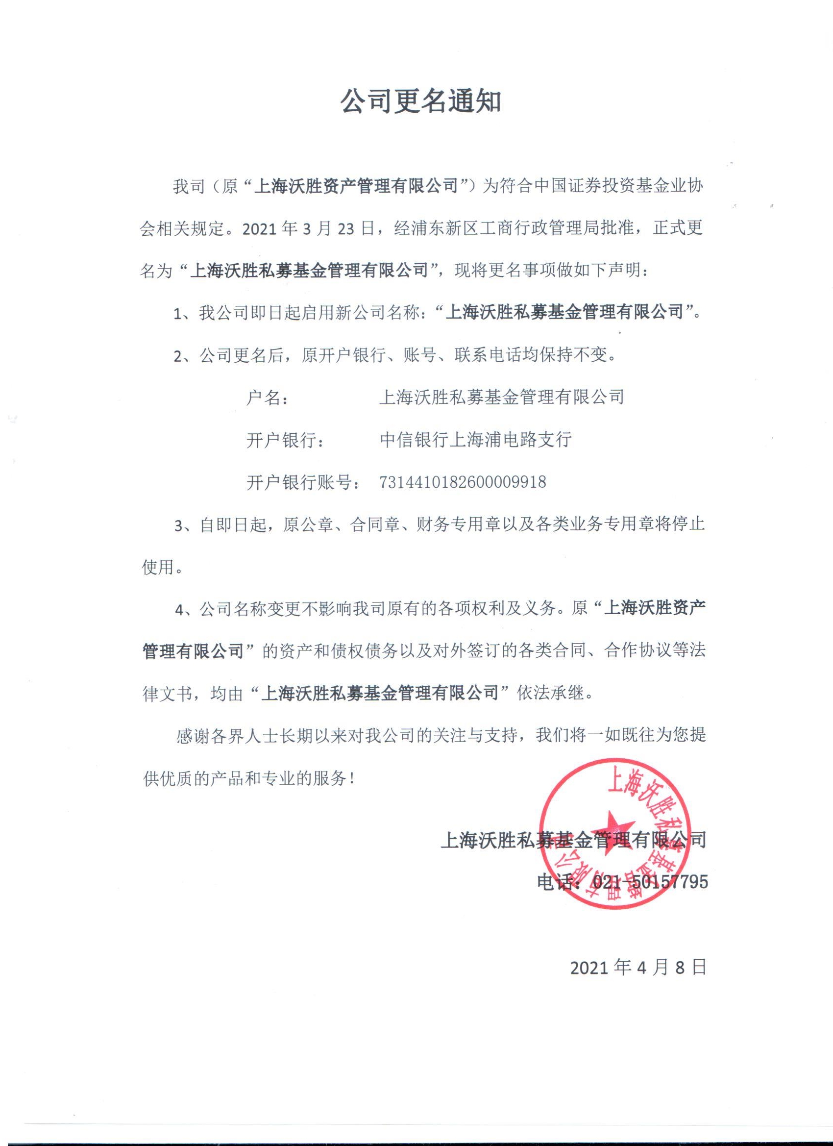 关于更名为上海沃胜私募基金管理有限公司的公告