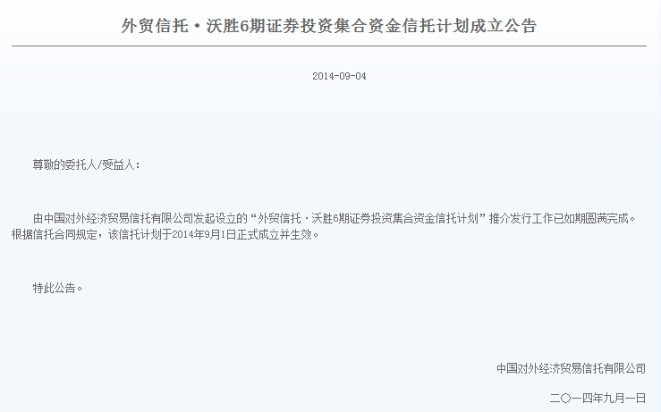沃胜六期已于2014年9月1日正式成立。以下为信托单位成立公告。