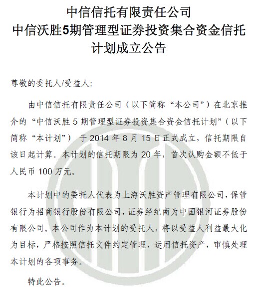 经过沃胜全体员工的不懈努力,沃胜资产规模日益壮大!沃胜五期于2014年8月15日正式成立。沃胜全体定将全心全力为客户管理财富,创造超额回报!